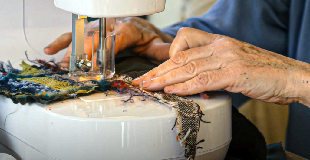 “My technique involves layering fabric, yarn, thread, and paper onto a wool background. This may then be painted, printed and embellished with a needle felting machine and free machine stitching. I build up layers of colour and texture by twisting, slashing and fraying the fabric.